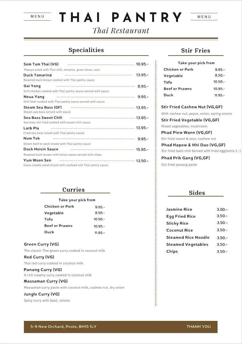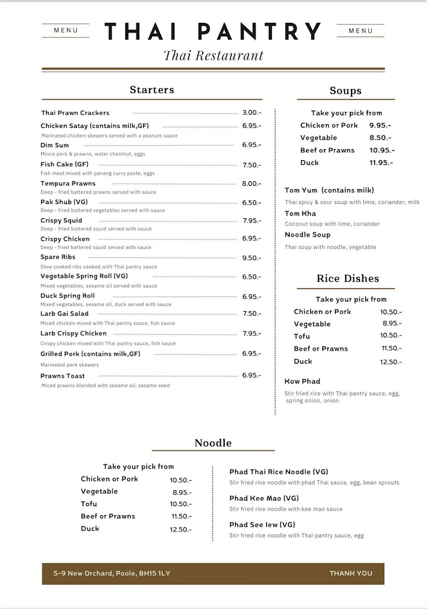 In conclusion, Thai Pantry offers an outstanding menu that brings the true essence of Thai cuisine to Poole. With its flavorful dishes, excellent service, and inviting ambiance, it's a must-visit for Thai food enthusiasts and newcomers alike.